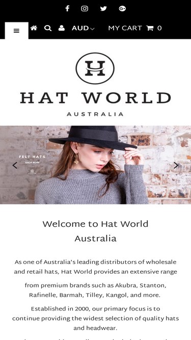 Leading distributor of online wholesale and retail hats in Australia since 2000. Hat World Australia offers an extensive range of hats from premium brands like Akubra, Kangol, Stanton, Barmah, Rafinelle and more..