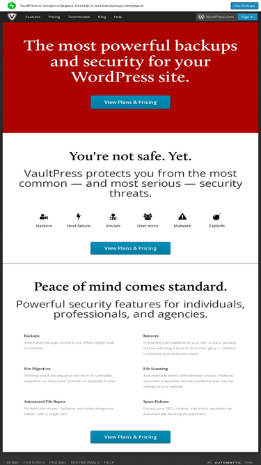 vaultpress is a subscription-based protection, security and backup service for wordpress blogs and sites. built on the same automattic grid that serves over 32 million wordpress.com blogs and 330 million monthly visitors, vaultpress secures your site.