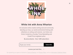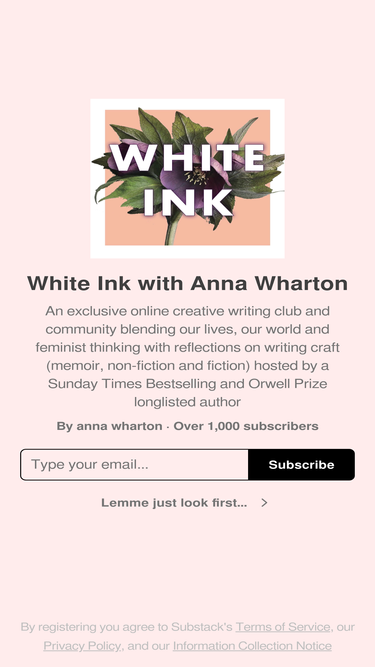 an exclusive online creative writing club and community blending our lives, our world and feminist thinking with reflections on writing craft (memoir, non-fiction and fiction) hosted by a sunday times bestselling and orwell prize longlisted author. click to read white ink with anna wharton, a substack publication with thousands of subscribers.
