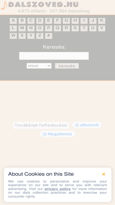 227.564 dalszöveg 4.875 előadótól. abc és album szerint rendezve, keresővel. dalszöveg.hu - magyar és külföldi dalszövegek gyűjteménye