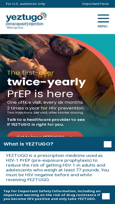 89%Learn about YEZTUGO® (lenacapavir) for PrEP (pre-exposure prophylaxis). See Important Facts for YEZTUGO®, including Important Warnings.