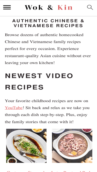 85%Browse dozens of authentic homecooked Chinese and Vietnamese family recipes perfect for every occasion. Experience restaurant-quality Asian cuisine without ever leaving your own kitchen! Newest video recipes Your favorite childhood recipes are now on YouTube! Sit back and relax as we take you through each dish step-by-step. Plus, enjoy the family stories that come with it! Latest recipes Here are our newest recipes from the Wok & Kin kitchen. We make sure to bring you the best dishes using seasonal and well-loved ingredients! Our Most Popular Recipes These family recipes are loved by thousands of our readers. They continue to