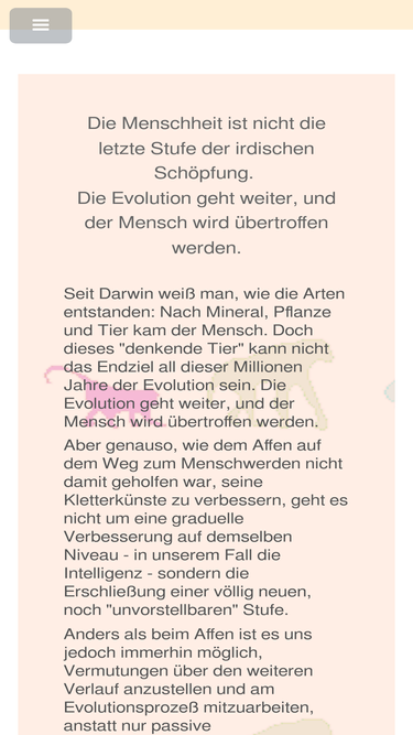 100%seit darwin weiß man, wie die arten entstanden: nach mineral, pflanze und tier kam der mensch. doch dieses denkende tier kann nicht das endziel dieser millionen jahre der evolution sein. die evolution geht weiter, und der mensch wird übertroffen werden.