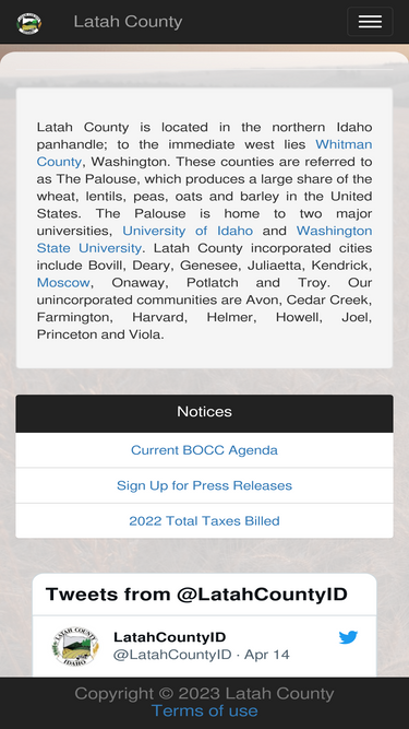 56%latah county is located in the northern idaho panhandle; to the immediate west lies whitman county, washington. these counties are referred to as the palouse, which produces a large share of the wheat, lentils, peas, oats and barley in the united states. the palouse is home to two major universities, university of idaho and washington state university. latah county incorporated cities include bovill, deary, genesee, juliaetta, kendrick, moscow, onaway, potlatch and troy. our unincorporated communities are avon, cedar creek, farmington, harvard, helmer, howell, joel, princeton and viola.