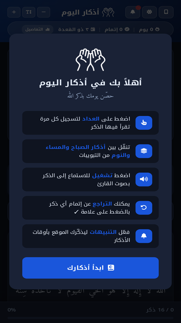 92%أذكار الصباح والمساء والنوم، أذكار المسلم اليومية للتحصين، مع عداد تفاعلي وتشغيل صوتي