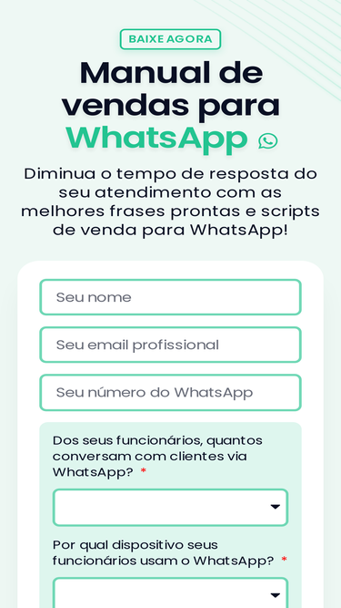 73%Faça o download do ebook de graça! ✨ Baixe agora Manual de vendas para WhatsApp Diminua o tempo de resposta do seu atendimento com as melhores frases prontas e scripts de venda para WhatsApp! Este ebook é para quem… Quer aumentar as suas vendas e utilizar o WhatsApp como canal principal Deseja se comunicar da […]