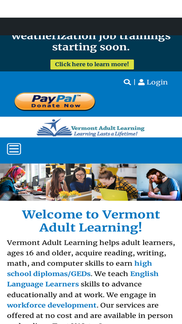 71%Welcome to Vermont Adult Learning! Vermont Adult Learning helps adult learners, ages 16 and older, acquire reading, writing, math and computer skills to earn high school diplomas/GEDs. We teach English Language Learners skills to advance educationally/at work. We engage in workforce development. Contact one of our Learning Centers or text VAL to 31996 for more information.