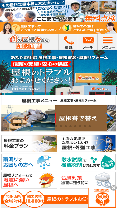 和歌山市、海南市、紀の川市で屋根工事、屋根葺き替え、屋根カバー工法、屋根塗装、棟板金工事、漆喰工事、雨漏り防水工事などの屋根リフォームをお考えなら街の屋根やさん和歌山店にお任せください。10,000棟の豊富な施工実績が貴方のお住まいをお守りします。