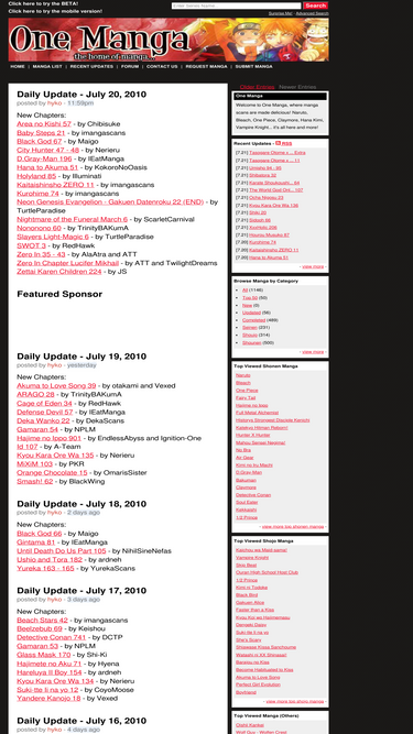 100%read your favorite mangas scans and scanlations online. onemanga free online manga reader. naruto, bleach, one piece, vampire knight and many more.