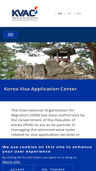 82%the international organization for migration (iom) has been authorized by the government of the republic of korea (rok) to act as its partner in managing the administrative tasks related to visa application services in ulaanbaatar for mongolian nationals and residents. before beginning your application, please check here for any exemptions related to your country of origin. the iom korea visa application center provides the following services: general information to visa applicants and authorized agencies distribution of application forms, information sheets, and checklists regarding visa requirements collection of visa applications (including passports and supporting documents) document completeness checks and verification services processing of visa applications and service fees submission of basic personal information and data into the korean visa portal delivery of visa applications to the korean embassy and collection of passports after the visa decisions return of passports and supporting documentation to visa applicants or authorized agencies other necessary services as required by visa applicants or the rok government visa finder please download the visa finder manual (korean and mongolian) and check the latest changes in the requirements. track your application to track your application status, please go to the “check application status and print” page of the korea visa portal (visa.go.kr). - please select “diplomatic office” among the “type of applications”. - provide all required information including the applicant’s passport number, name in english as shown in the passport, and date of birth. making an appointment with the kvac is free of charge please note that the only official and valid way to make an appointment with the kvac is contacting us by email (kvacmninfo@iom.int) or by phone at (+976) 7766-8888. should you be charged to make an appointment, please kindly report it to the kvac immediately. this irregular behavior will cause you pro