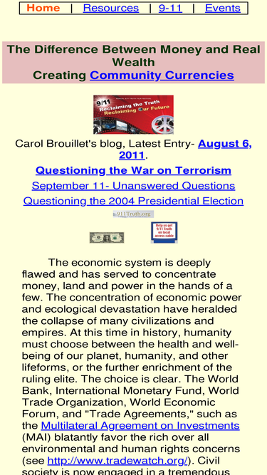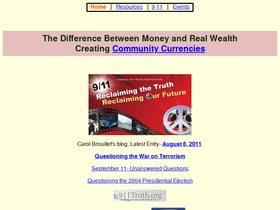 66%carol brouillet's website on community currency, local currency, global economics, 9-11, gift economy, media deception, government deception, questioning money, questioning government, questioning media, world social forum, questioning world trade organization, questioning international monetary fund, questioning world economic forum, 9/11 commission, 9/11 conspiracy, 9/11 report, deception dollar, fraudulent event note, election deception, bush buck