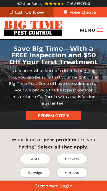 81%The local pest control pros at Big Time Pest Control are here to help Redding property owners eliminate pest problems - no matter how tough!