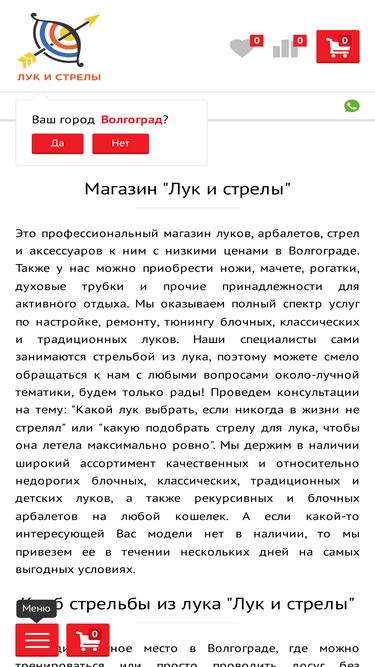 82%Профессиональный магазин луков, арбалетов, стрел и ножей в Волгограде с доставкой по РФ. В продаже есть все типы луков и арбалетов: блочные, классические, традиционные, рекурсивные - для спорта и охоты. Обучение стрельбе из лука, настройка и ремонт любой сложности.