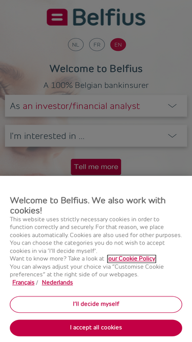 welkom bij belfius bank, (jonge) particulier, ondernemer, of openbare of socialprofitinstelling! welk project u ook hebt, bij ons vindt u de financiële oplossing. bienvenue chez belfius banque où (jeunes) particuliers, entrepreneurs, institutions publiques ou sociales trouveront une solution financière à leurs projets.