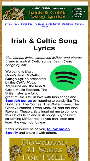 100%irish song lyrics maintains the tradition of learning irish music by ear. it features irish songs, lyrics, celtic music downloads, and chords. listen to irish songs. learn celtic songs by ear!