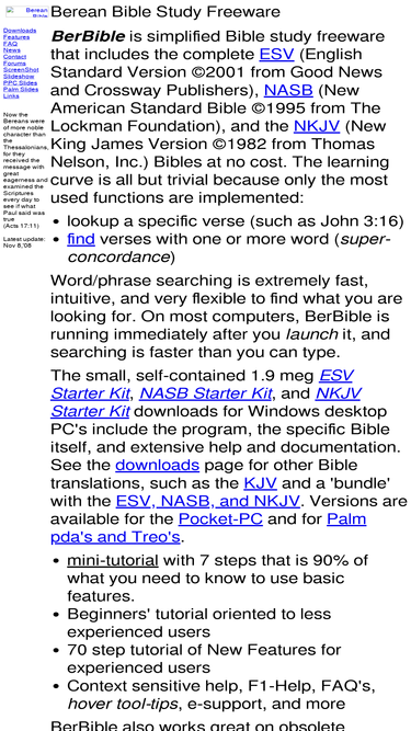 79%great for christian who want easy-to-use freeware rather than complicated, bloated, and sluggish software oriented to bible scholars and techies, includes the esv (english standard version), nasb (new american standard bible), and the nkjv (new king james version) at no cost. trivial learning curve because only the 'sola scriptura' essentials of verse lookup and concordance searching are implemented.