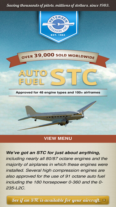 85%Since 1983 over 38,000 airplanes worldwide have been issued a Petersen Auto Fuel STC. These numbers, coupled with nearly 40 years of use clearly demonstrates the suitability of automotive gasoline for General Aviation. Search for your engine and airframe STC. All MOGAS STCs automatically approve 91UL and 94UL fuels.