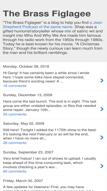 86%"the brass figlagee" is a blog to help you find a jean shepherd podcast of the same name. shep was a gifted humorist/storyteller whose mix of satiric wit and insight into who and why we are made him famous through his radio work from the 1950s through 1980s. today he is best-known for his movie, "a christmas story," though the newly curious can learn much from the man and his brilliant ramblings.