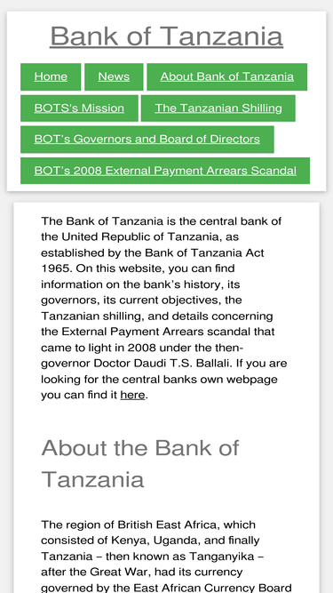 76%the bank of tanzania is the central bank of the united republic of tanzania, as established by the bank of tanzania act 1965. on this website, you can find information on the bank’s history, its governors, its current objectives, the tanzanian shilling, and details concerning the external payment arrears scandal that came to light in 2008 under the then-governor doctor daudi t.s. ballali.