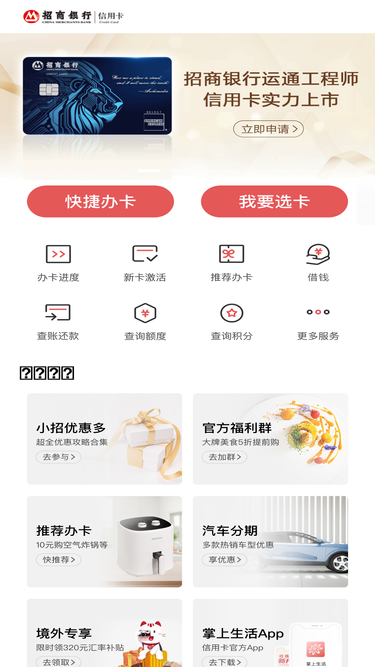 100%招商银行信用卡中心,提供在线免费办理申请信用卡业务,满足有网上办理信用卡需求的用户,避免他人代办信用卡带来的风险。