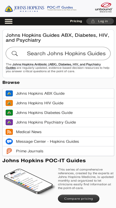 88%official website of the johns hopkins antibiotic (abx), hiv, diabetes, and psychiatry guides, powered by unbound medicine. johns hopkins guide app for ios, iphone, ipad, and android included.