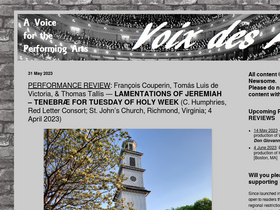 Founded in 2008, the primary goal of VOIX DES ARTS is to supplement the ever-decreasing—and, in terms of quality, the ever-deteriorating—coverage of the Performing Arts by mainstream media outlets. All content is written and copyrighted by Joseph A. Newsome.