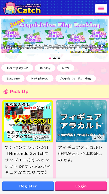 86%アイキャッチなら!! 新規登録で《5回無料チケット》をプレゼント!+ 豪華景品が当たるビンゴ大会!抽選会を実施中!! オンラインでクレーンゲームをPLAYするなら『アイキャッチオンライン』で決まり^^ いつでもどこでも24時間年中無休!オンクレするならスマホで遊べるiCatchOnline!