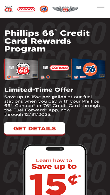 select your savings, every day with the phillips 66®, conoco® or 76® credit cards. apply online today. earn 5 cents per gallon in rewards when you pay using your card in the fuel forward™ app. or earn 3 cents per gallon in rewards when you swipe to pay at our fuel stations with your phillips 66®, conoco® or 76® credit card.