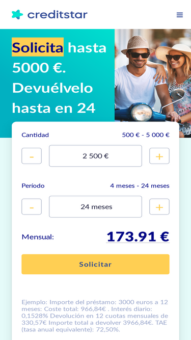 84%solicita un préstamo en creditstar de hasta 5 000 €. el importe del préstamo se transferirá a tu cuenta en 15 minutos.
