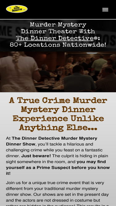 77%America's LARGEST interactive murder mystery dinner show! Now playing nationwide. Experience a hilarious mystery with a fantastic dinner. Private shows and events for companies and groups!