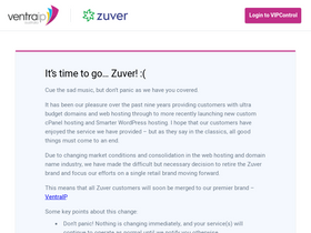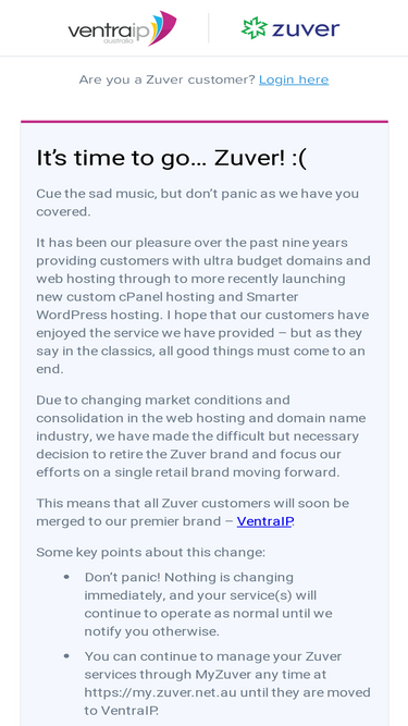 100%Zuver Pty Ltd is closing its doors and moving its customers and services over to its sister company VentraIP Australia.