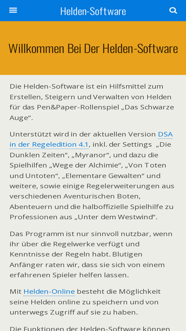 100%Die Helden-Software ist ein Hilfsmittel zum Erstellen, Steigern und Verwalten von Helden für das Pen&Paper-Rollenspiel "Das Schwarze Auge". Unterstützt wird in der aktuellen Version DSA in der Regeledition 4.1, inkl. der Settings "Die Dunklen Zeiten", "Myranor", und dazu die Spielhilfen "Wege der Alchimie", "Von Toten und Untoten", "Elementare Gewalten" und weitere, sowie einige Regele ...