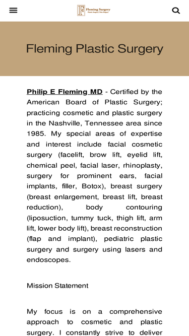 68%dr. philip e. fleming is certified by the american board of plastic surgery and has practiced cosmetic surgery and plastic surgery in the nashville, tennessee area since 1985. his special areas of expertise and interest include facial cosmetic surgery (facelift, brow lift, eyelid lift, chemical peel, facial laser, rhinoplasty, surgery for prominent ears, facial implants, collagen , perlane, restylane, juvederm, dysport, botox), breast surgery (breast enlargement, breast lift, breast reduction), body contouring (liposuction, tummy tuck, thigh lift, arm lift, lower body lift), breast reconstruction (flap and implant), pediatric plastic surgery and surgery using lasers and endoscopes.