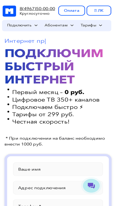 89%Бесплатное подключение Интернета и ТВ. Тарифы от 299 руб., скорости до 1 Гб/с, Подключение в Подольске и районе. Выделенная линия