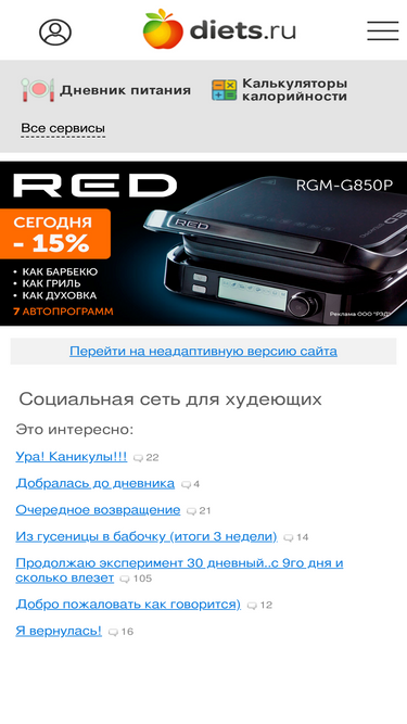 96%худеем нескучно вместе с diets.ru! более 260 диет и реальные отзывы тех, кто уже похудел на них. калькулятор калорийности, дневники питания и спорта.