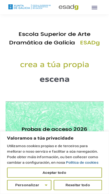86%Dirección escénica e dramaturxia - titulación superior en Arte Dramática na especialidade de Dirección escénica e dramaturxia, que equivale a un grao universitario. A ESADg forma profesionais capacitados para crear, dirixir e escribir proxectos escénicos de calidade.