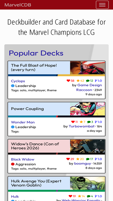 90%build your deck for marvel champions by fantasy flight games. browse the cards and the thousand of decklists submitted by the community. publish your own decks and get feedback.