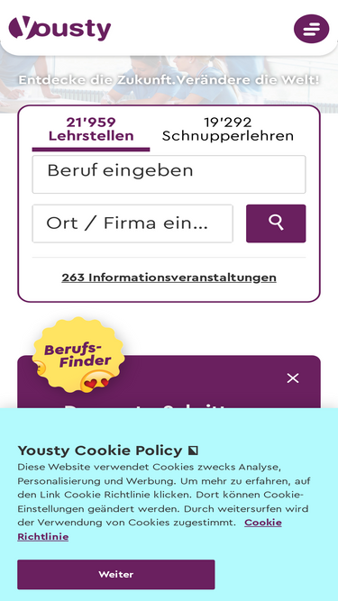 100%finde mit dem berufsbildungsportal von yousty.ch die passende lehrstelle oder schnupperlehre und starte 2024 oder 2025 erfolgreich in die berufswelt!