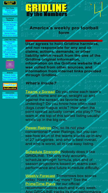 89%Gridline: America's Weekly Football Form. Mathematical analysis of upcoming pro football games and final score projections.