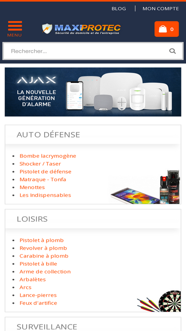 76%maxiprotec - sécurité du domicile et de l'entreprise, surveillance, alarme, fermeture et auto défense et arme de défense avec une large gamme de bombe lacrymogène, taser, pistolet d'alarme et de défense.