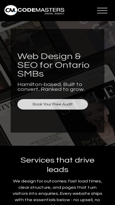 72%Welcome! We are CodeMasters, a web design agency in Hamilton offering turnkey solutions for small businesses. Specializing in website design and web development, social media marketing and management, and more! Our strategic creation and management can help to further the success of your business.