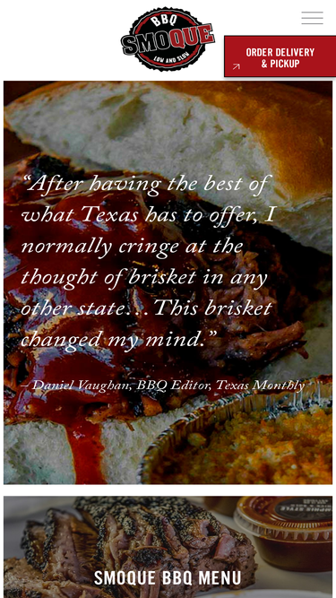 87%ALWAYS SMOKIN’ We'll see ya, when we see ya: breakfast, lunch and dinner– 7 days a week Proudly Texan, Distinctly Houstonian. We make traditional Texas BBQ – Black pepper, smoke, love, and no sauced meats (unless you ask). But, we’re Houstonian first and foremost.