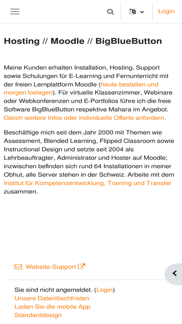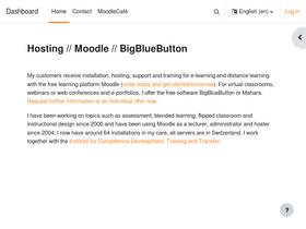 57%meine kunden erhalten installation, hosting, support sowie schulungen für e-learning und fernunterricht mit der freien lernplattform moodle (heute bestellen und morgen loslegen). für virtuelle klassenzimmer, webinare oder webkonferenzen und e-portfolios führe ich die freie software bigbluebutton respektive mahara im angebot. gleich weitere infos oder individuelle offerte anfordern. beschäftige mich seit dem jahr 2000 mit themen wie assessment, blended learning, flipped classroom sowie instructional design und setzte seit 2004 als lehrbeauftragter, administrator und hoster auf moodle; inzwischen befinden sich rund 64 installationen in meiner obhut, alle server stehen in der schweiz. arbeite mit dem institut für kompetenzentwicklung, training und transfer zusammen.