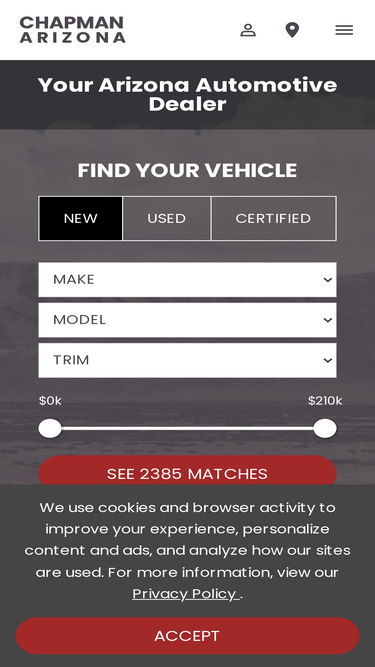 94%Chapman Automotive proudly serves Phoenix, Scottsdale, Tempe, Chandler, and Gilbert, Arizona, offering special deals on cars, trucks, and SUVs. Explore our comprehensive automotive services and discover a seamless experience tailored to your needs.