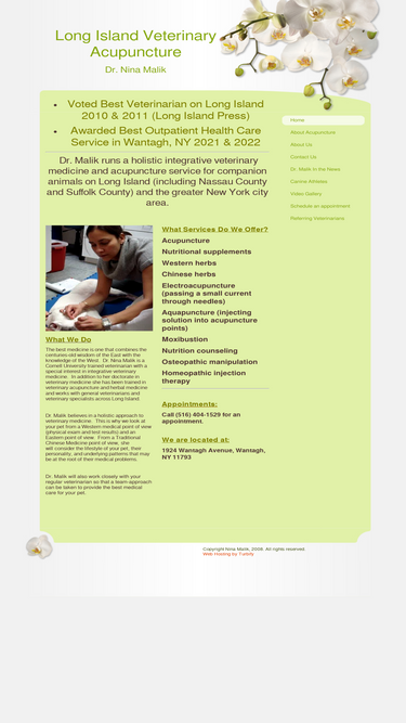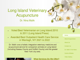 62%dr. nina malik runs a holistic acupuncture service for dogs, cats, and exotic animals servicing long island and the greater new york city metro area. she practices integrative veterinary medicine in farmingdale and bohemia.