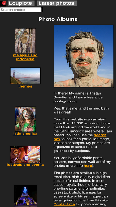 80%Hi there! My name is Tristan Savatier and I am a freelance photographer.Yes, that's me, and the mud bath was great! From this website you can view more than 16,000 amazing photos that I took around the world and in the San Francisco area where I am based. You can use the search box to look for a particular image, location or subject. My photos are organized in series (photo galleries) by subjects. You can buy affordable prints, posters, canvas and wall-art of my photos (more info here). The ...