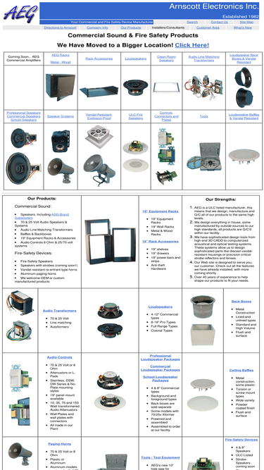 100%arnscott electronics inc is a major supplier of commercial sound and life safety devices. we provide products such as equipment racks, loudspeakers, adg brand high powered subwoofers, line matching transformers, baffles, backboxes, autoformers, attenuators, l-pads, life safety devices, strobe indicators and much more.