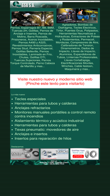 100%gsa s.a. fabrica de pernos, tuercas y golillas. esparragos b7, b8 y b8m, hilos laminados en frio. ferreteria industrial, representaciones de mas de 20 marcas de prestigio mundial. maestranza. tecles, pernos, recubriemientos anticorrosivos, golillas, torque perfecto, decincrustaci贸n de calderas y tubos, limpieza mecanica de tubos, maquina para limpiar tubos de calderas, sistema de limpieza de tubos de calderas, limpiadores de tubos elliott tool, limpiadores y accesorios industriales para limpiar tubos, goodway, equipos para limpieza interior de tubos, equipos para limpieza de tubos e intercmbiadores de calor, tensionadores hidraulicos de pernos, cortador hidraulicos de tuercas, remachadoras neumatica hidraulica, tijeras de podar neumaticas, taladros magneticos, pernos parker pequeños especiales y hilos finos, aceros duplex, pernos flanges y otros, hastalloy c276, inoxidables, aleaciones inconel, monel 400-500-600, inoxidables 231-347-316ti-317l-310-9046-14529 hastalloy, golillas nord lock, belleville washer, golillas dti con silicona y certificación astm, ventiladores neumáticos a prueba de explisión.