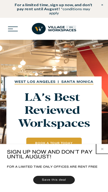 97%village workspaces brings spacious and luxurious office space to the thriving and growing businesses in westside la, on the border of santa monica. bringing together a flexible approach and affordable luxury, we’ve been creating boutique space and experience since 2011—enabling our members to achieve great things.