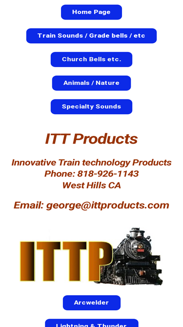 80%Home Page Train Sounds / Grade bells / etc Church Bells etc. Animals / Nature Specialty Sounds ITT Products Innovative Train technology ProductsPhone: 818-926-1143West Hills CA Email: george@ittproducts.com Arcwelder Lightning & Thunder Accessories About US Hobby sound modules for model railroaders and other hobby enthusiasts We are not shipping to countries outside the USA at this … Continue reading "home"